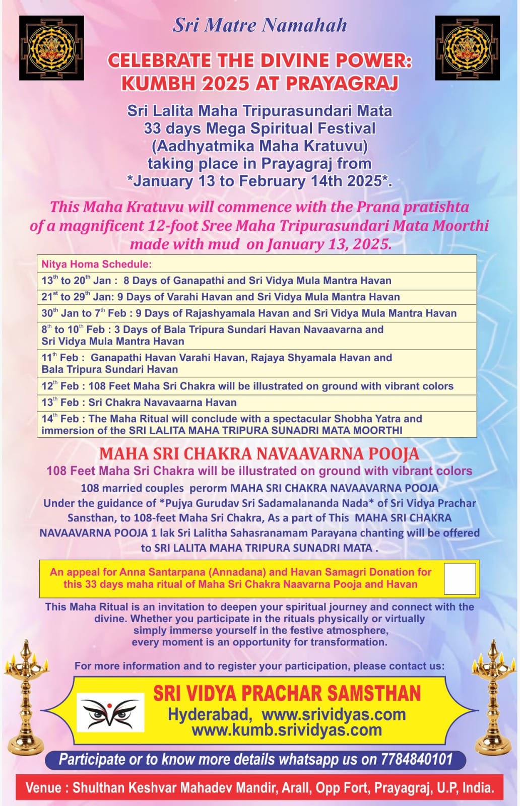 Ans. SRI CHAKRA NAVAAVARNA PUJA WILL BE PERFORMED TO SRI CHAKRA MERU OR BHOO PRASTHARA . BY ILLASTRATING 108 FOOT SRI CHAKRA ON THE GROUND WITH VIBRENT COLOURS. 108 MERREED COUPLES SIT AROUMD MAHA SRI CHAKRA & PERFORME SRI CHAKRA NAVAAVARNA PUJA BY THEM SELF UNDER THE GUIDENCE OF PUJYA GURUDEV SRI SADAMALANANDA NADHA.